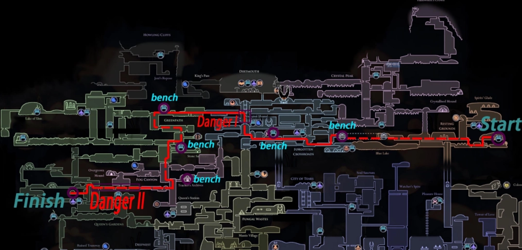 初始出生点位于深渊左下部区域,装备国王之魂护符方可进入。在尽头黑卵处使用梦之钉触发回忆后,正式开启征途。建议初期路线:遗忘十字路获取地图→苍绿之径习得冲刺→雾之峡谷→真菌荒地→泪水之城。战斗时注意骨钉攻击需配合方向键控制距离,空中下劈击中目标可触发反弹机制,熟练后能实现连续空中突进。