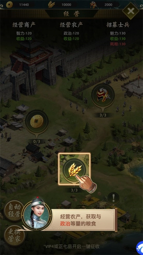 经营各类产业如农场或商铺获取银两,用于升级门客或扩充兵力,玩家可通过府中双儿进行资产管理,提高资源效率。