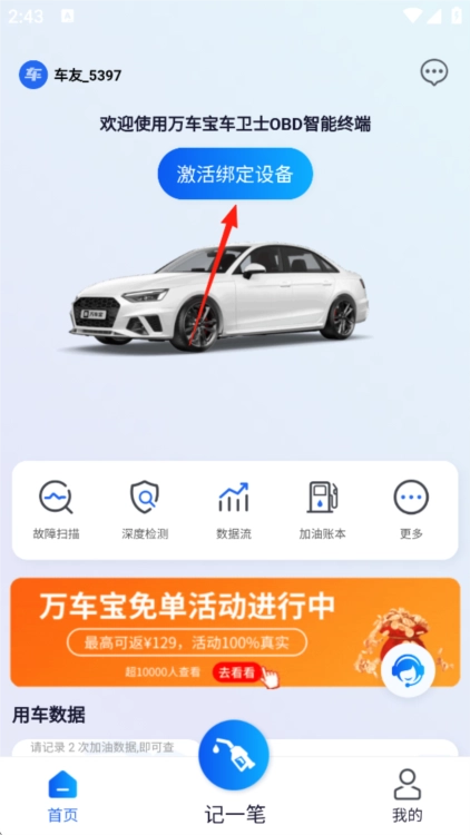 1、使用手机号登录万车宝APP,未注册账号会自动完成注册,登录后在首页点击“激活绑定设备”按钮。