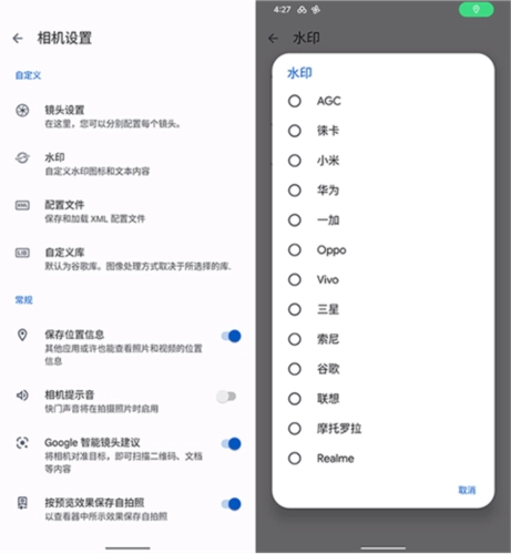 2、相机水印方面,进入相机设置-水印,这里可以选择机型、以及自定义添加手机型号,看你喜欢来设置就行了。设置好后,返回相机,先关闭右上角的水印图标,再重新点开就会生效了。
