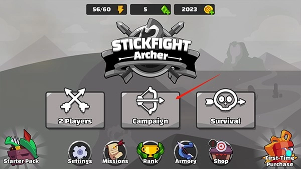 1. 启动火柴人弓箭手后,主界面呈现三大核心模式:左侧无尽模式、中央闯关模式(Campaign)、右侧多人线上模式。