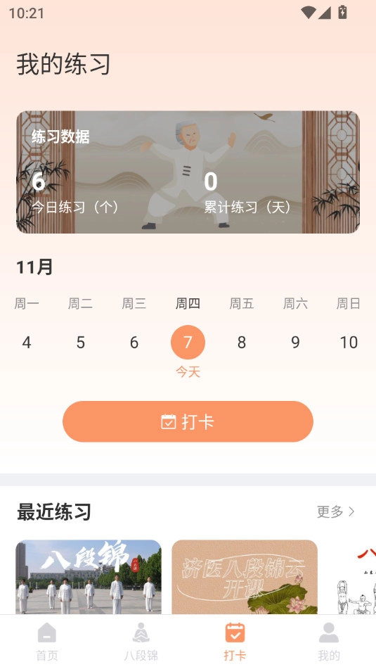 主界面底部导航栏选择"训练"页签,点击日历图标进入打卡模块