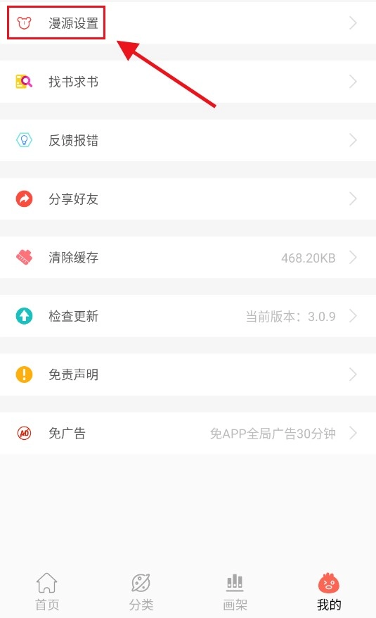 2. 选择顶部【漫源设置】选项