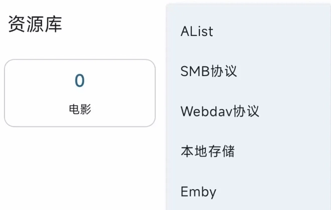 2、媒体库配置:接入阿里云盘、Alist、WebDAV等存储服务,或绑定Emby、Jellyfin媒体服务器