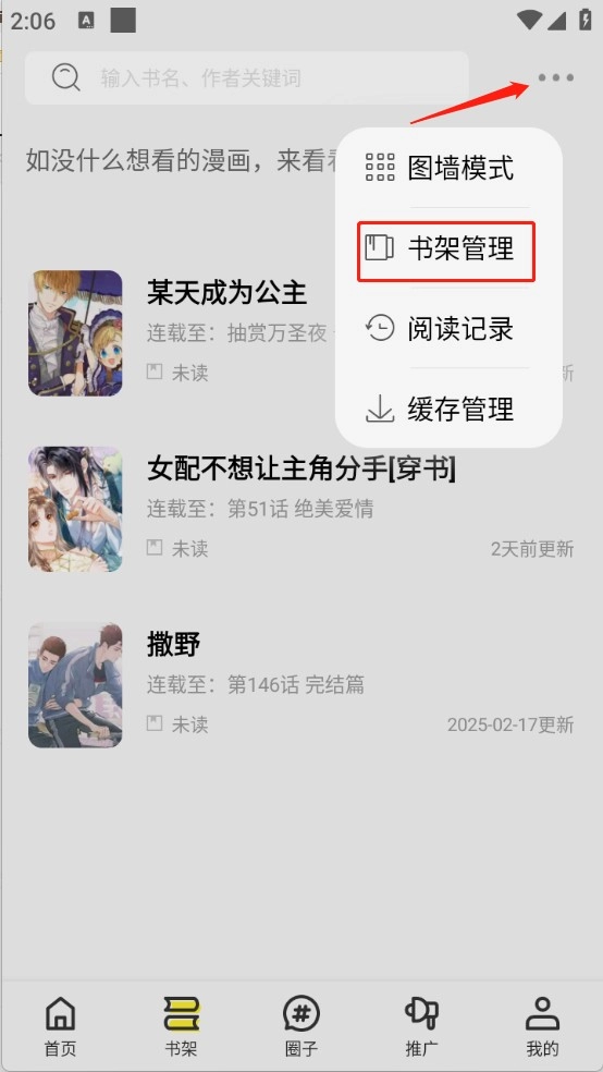 2、点击右上角三点图标,选择“书架管理”功能。