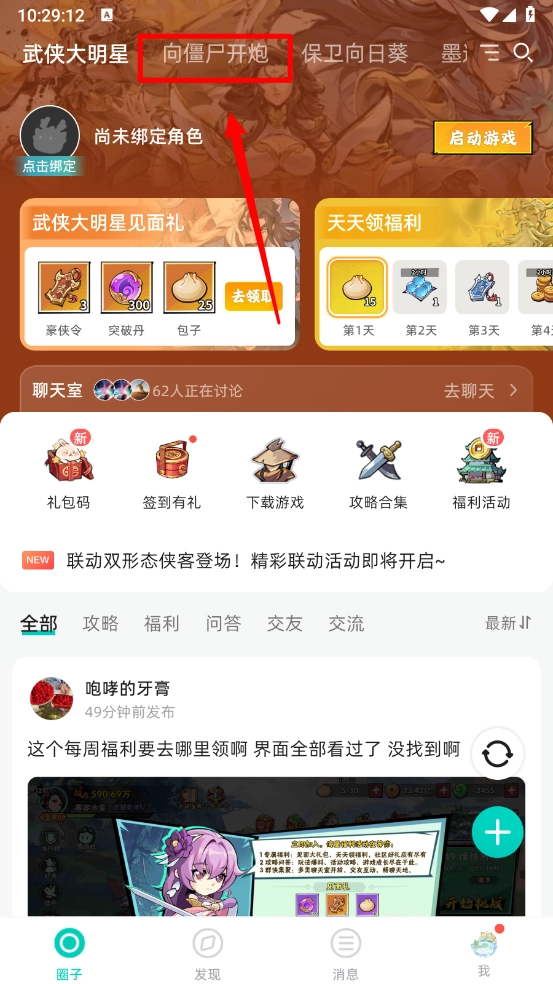 2、在圈子页面切换“向僵尸开炮”。