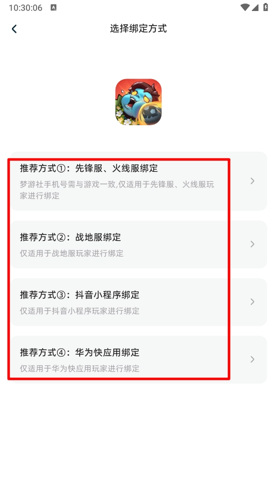 4、选择绑定方式(如战地服)。