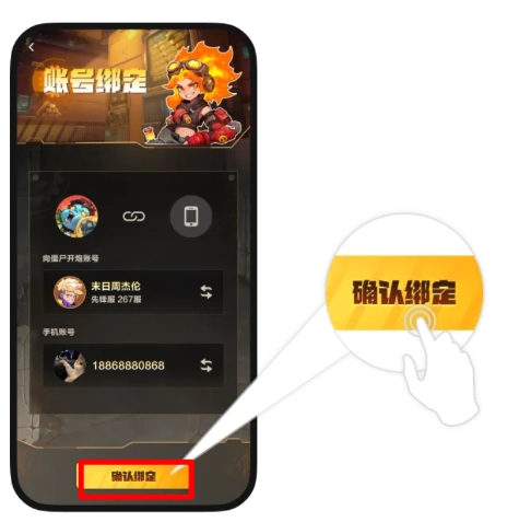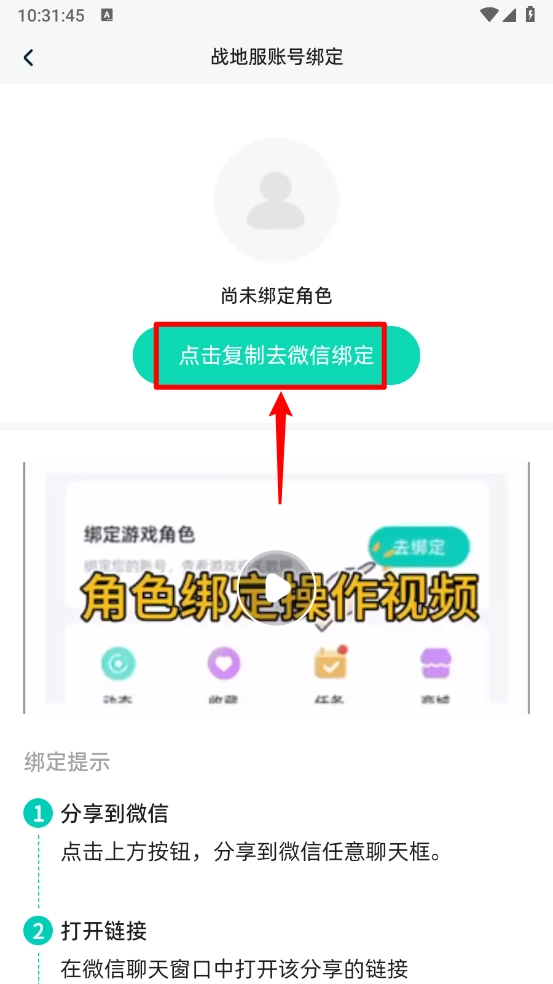 - 按提示操作完成绑定,例如绑定向僵尸开炮:切换对应游戏圈,点击头像绑定,选择方式(如战地服),复制链接到微信操作,确认后返回查看角色更新。