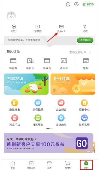 绑定购物卡:进入个人中心,选择礼品卡,点击卡片管理,输入实体卡卡号和密码提交。