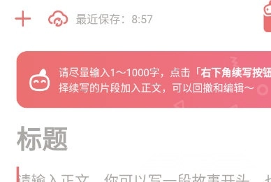 写作过程中点击左上角彩云图标,内容自动存入"我的作品"。中断创作后可随时返回继续编辑。