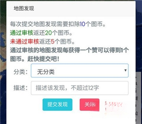 3、在发现窗口中选择发现的类型,输入描述后点击提交,分享你的发现。