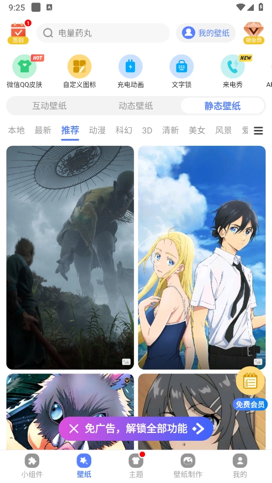 心动主题壁纸由珠海众森网络科技有限公司开发,专注手机桌面个性化定制。该应用整合高清壁纸资源库,支持动态、静态、3D等多种类型,涵盖动漫、风景、抽象等主题分类。用户可自由调节全局透明度,适配微信/QQ透明皮肤,但部分老旧机型可能出现显示异常。桌面小组件功能包含步数统计、倒计时、快捷支付码等实用工具,不过复杂组件可能增加系统耗电。提供应用锁密码保护,支持数字、图形和文字加密,但频繁解锁可能影响操作效率。每日更新精选壁纸,支持关键词搜索和本地图片扫描,部分高级主题需会员权限。
