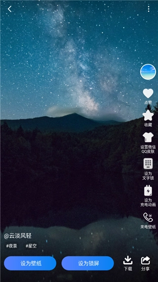 壁纸资源库每日新增高清素材,按风格标签分类整理,包含动态特效和4D重力感应系列。锁屏与桌面分开设置,点击预览页底部按钮直接生效。