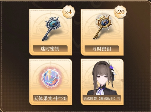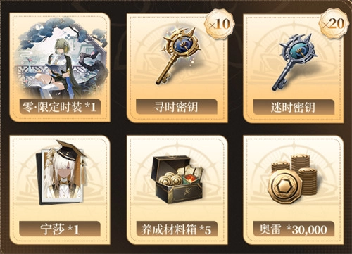 1. 包含零·限定时装×1、宁莎角色×1、寻时密钥×10、迷时密钥×20