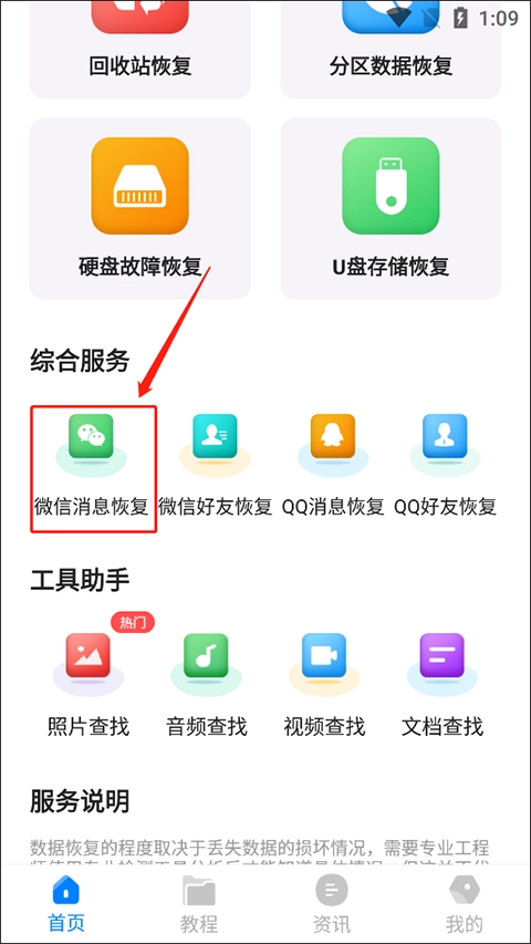 1. 下载软件,安装打开后选择“微信消息恢复”。