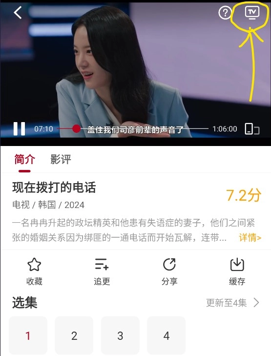 3. 点击播放界面任意位置,找到投屏按钮(TV图标)。