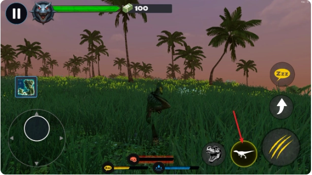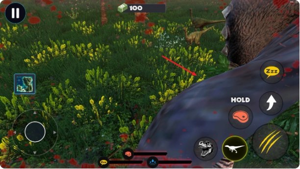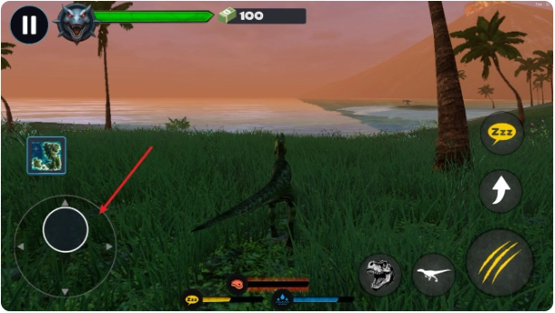2、通过虚拟摇杆控制恐龙移动方向,长按实现持续前进或后退,追击猎物或躲避威胁。
