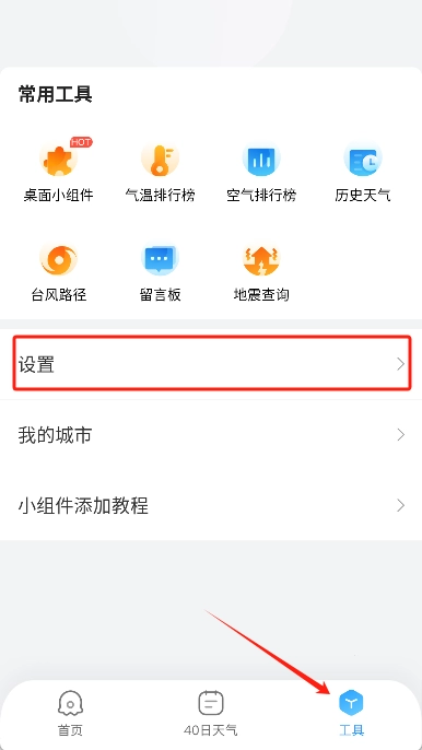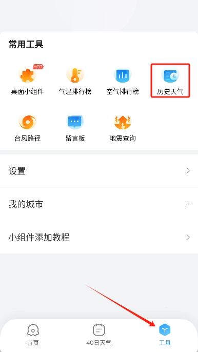 2、从底部导航栏选择“工具”,点击“历史天气”功能。