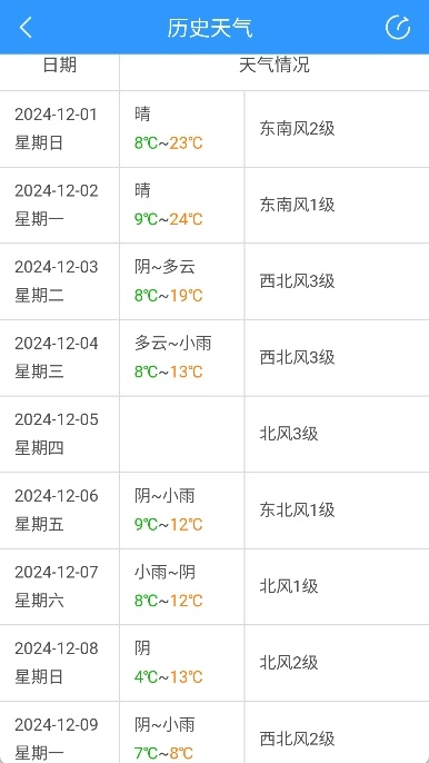 4、向下滑动页面,查看当月每一天的具体天气记录。