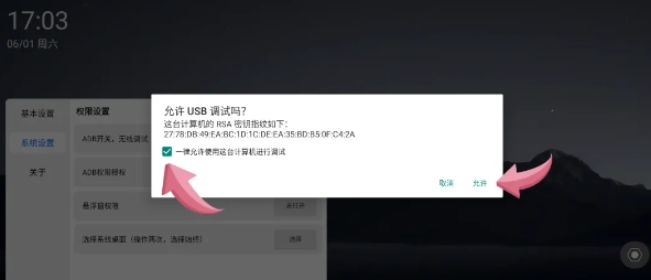 3.授权ADB调试,勾选“一律允许使用这台计算机进行调试”,点击允许。