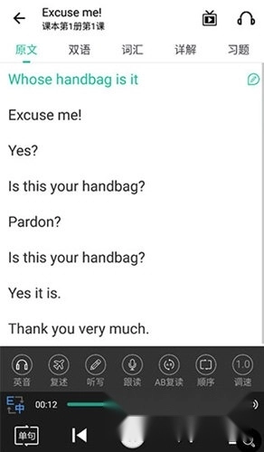 5、进入课程页(以第1册第1课为例),支持原文/双语模式切换