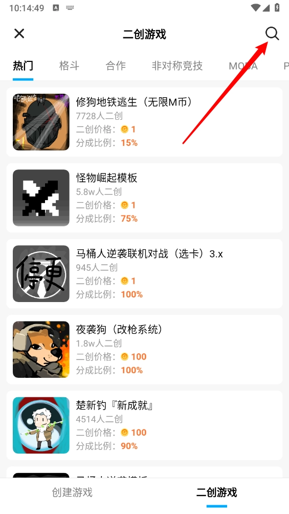 4、切换至"二创游戏"分区,点击顶部搜索图标