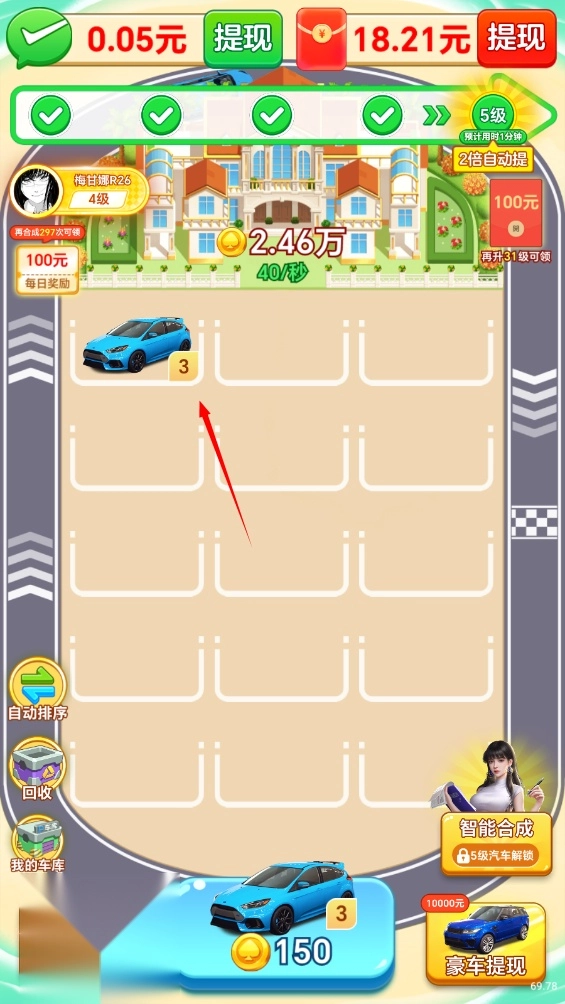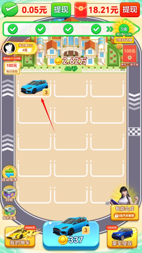 游戏支持提现功能,但规则有限制。新手阶段:合成LV3车辆提0.11元,合成LV5车辆提0.27元,累计约0.38元。后期要求:车辆升至35级或完成"收集所有神车"任务,才能解锁新提现机会。