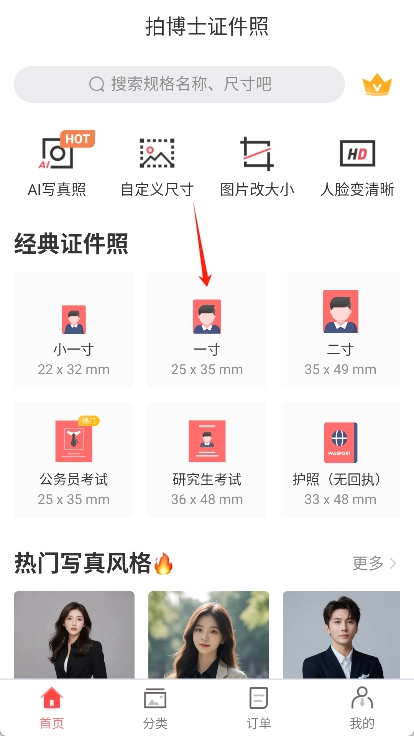 1. 在首页选择需要的证件照类型,如一寸照片。