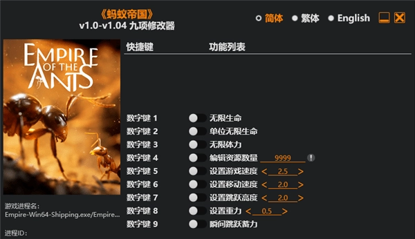 蚂蚁帝国修改器专为电脑版设计,提供九项数值修改功能。包括无限生命值、无限耐力值、跳跃立即充能。编辑资源数量,设置跳跃高度、重力参数。帮助指挥昆虫大军征服敌人巢穴,建造不同巢房调整战略。与本地野生动物结盟,带领族群穿越危险森林。