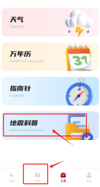 1、打开地震云播报app桌面图标,进入工具页面,选择地震科普。