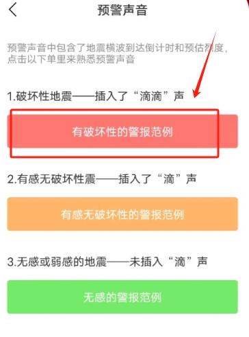 3、在声音列表界面,点击播放图标,即可激活地震警报声音。