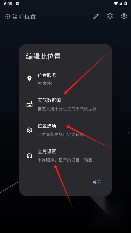 6、选择笔形图标自定义设置,如天气数据源、位置选项或全局参数。