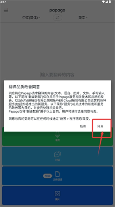 启动APP阅读优化说明,点击同意。主界面选择语音或图像模式。语音输入说话,系统生成翻译。对话功能实时互译。图像拍照识别文字。