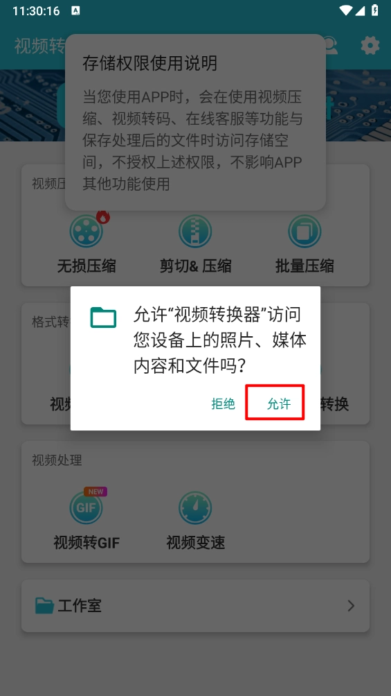 视频格式转换操作:安装后打开视频转换器,点击主页“视频格式转换”,允许权限访问相册。选择目标片段,进入编辑界面设置文件格式、时间或分辨力,完成后点“导出”保存或分享。