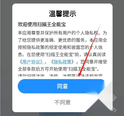 1、在应用商店下载安装扫描君最新版,启动应用点击"同意"进入操作界面