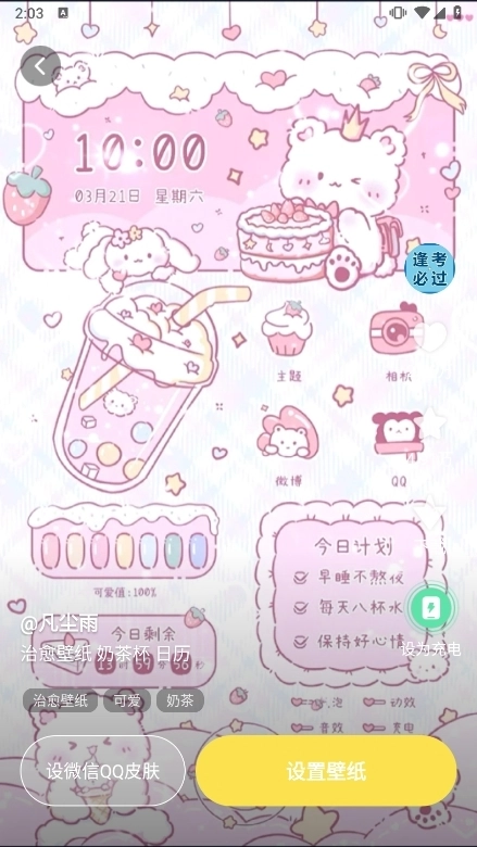 1、设置锁屏壁纸:打开百变桌面壁纸APP,浏览主界面选择喜欢的壁纸,点击进入展示页,选择“设置壁纸”按钮,加载完成后即生效。