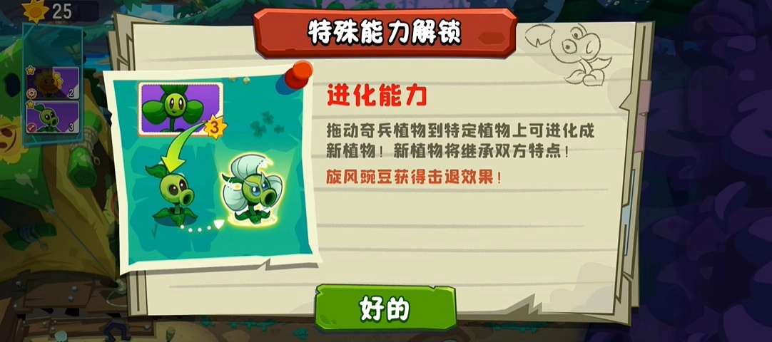 拖动特定植物到另一植物上触发进化,例如三叶草与豌豆射手结合。