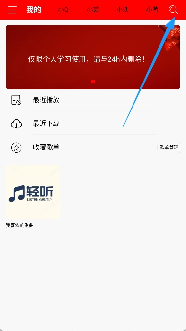 1、在轻听音乐主界面点击右上角搜索图标。