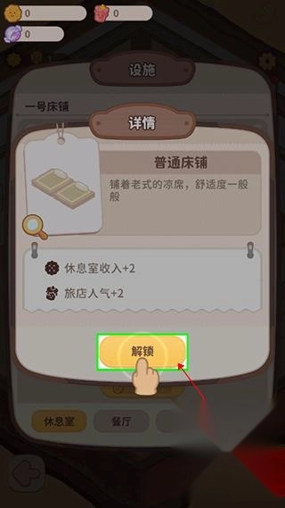 4、在设施页面选择普通床铺解锁并放置,尽量多设置以容纳更多旅客。