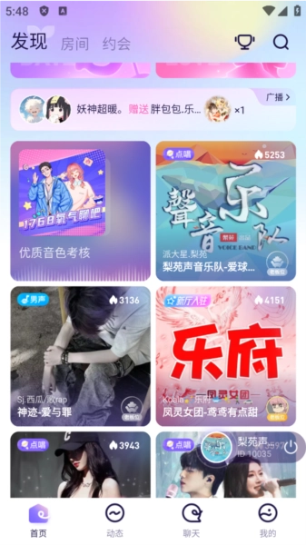 • 语音派对房:支持12人同时在线,提供K歌/Pia戏/桌游三种场景模板