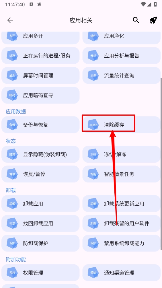 应用相关页面选择清除缓存,自动扫描全应用残留数据。