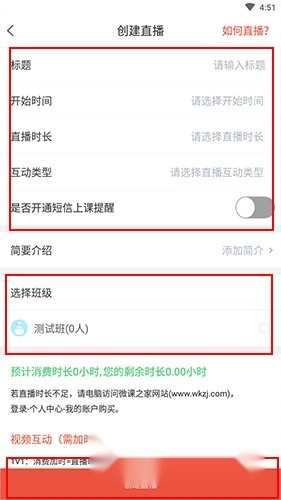 2、填写课程主题、时间等信息,点击"创建直播"开课。