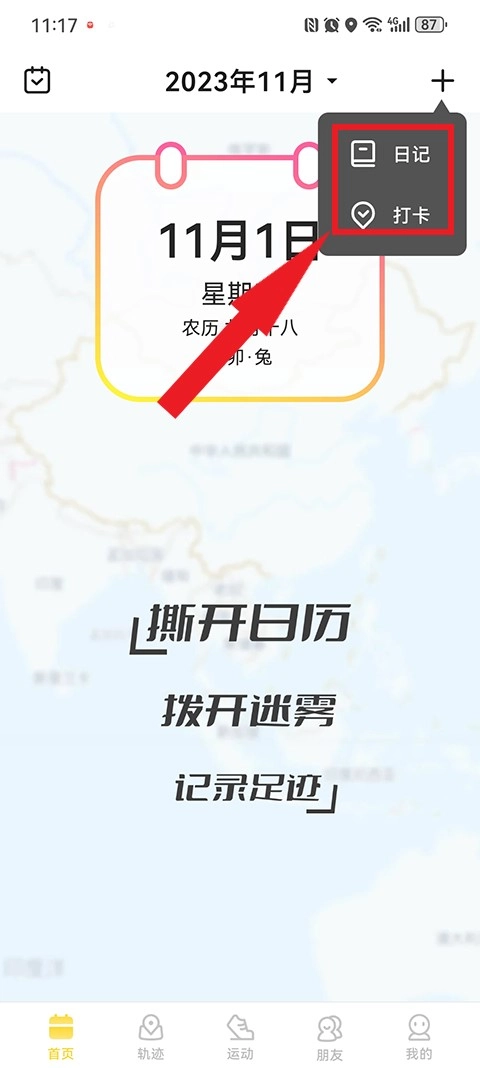 用户下载并打开软件后,在首页点击右上角加号,进入日记或打卡选项。