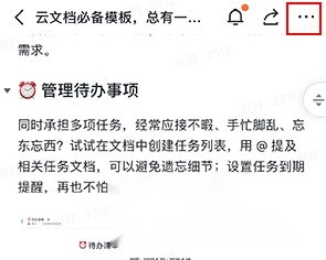 1、打开最新版飞书文档,访问目标文件,点右上角三个点。