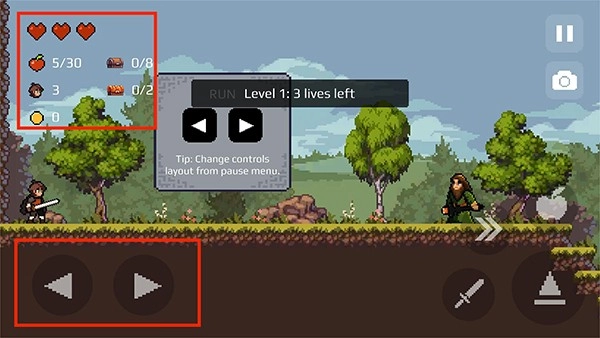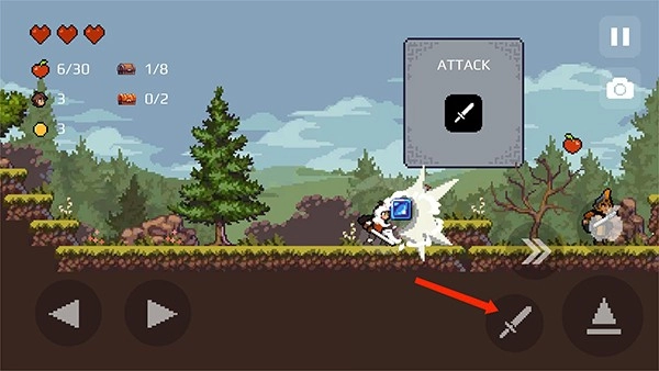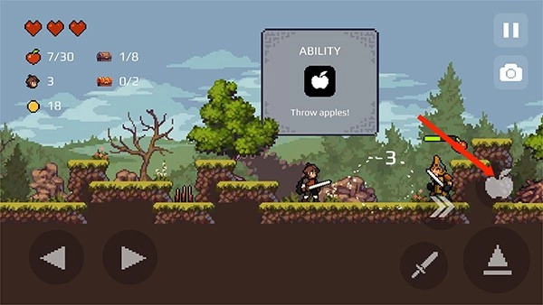 6、左上角显示生命值、苹果数、宝箱数和金币,点击右边【苹果】图标消耗苹果远程攻击敌人。