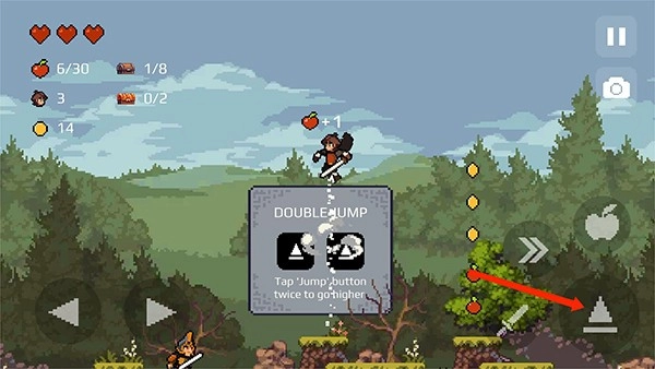 5、使用超级跳接取高处苹果,第一次跳跃快降落时再次点击跳跃。