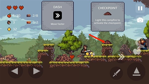 7、点击右边【箭头号】图标猛冲躲避伤害,遇到陷阱如尖刺使用冲刺通过。