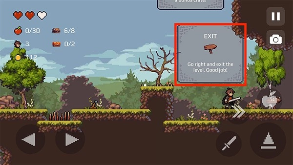 9、出现【EXIT】指示牌往右走通关,获得苹果、金币等奖励,点击【双箭头号】进入下一关。