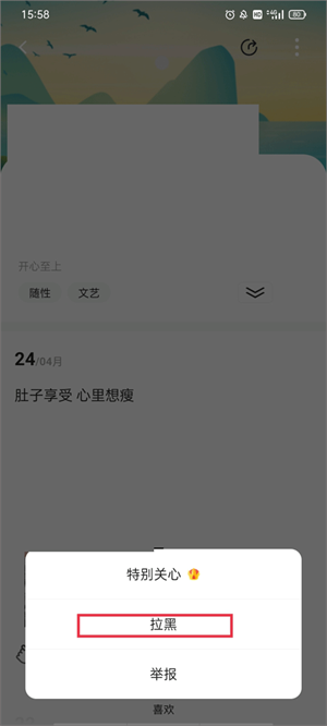 2、这时下方就弹出了特别关心、拉黑、举报这几个功能选项,点击拉黑按钮。