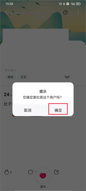 3、再次确定并要拉黑这个用户,使提示窗关闭。